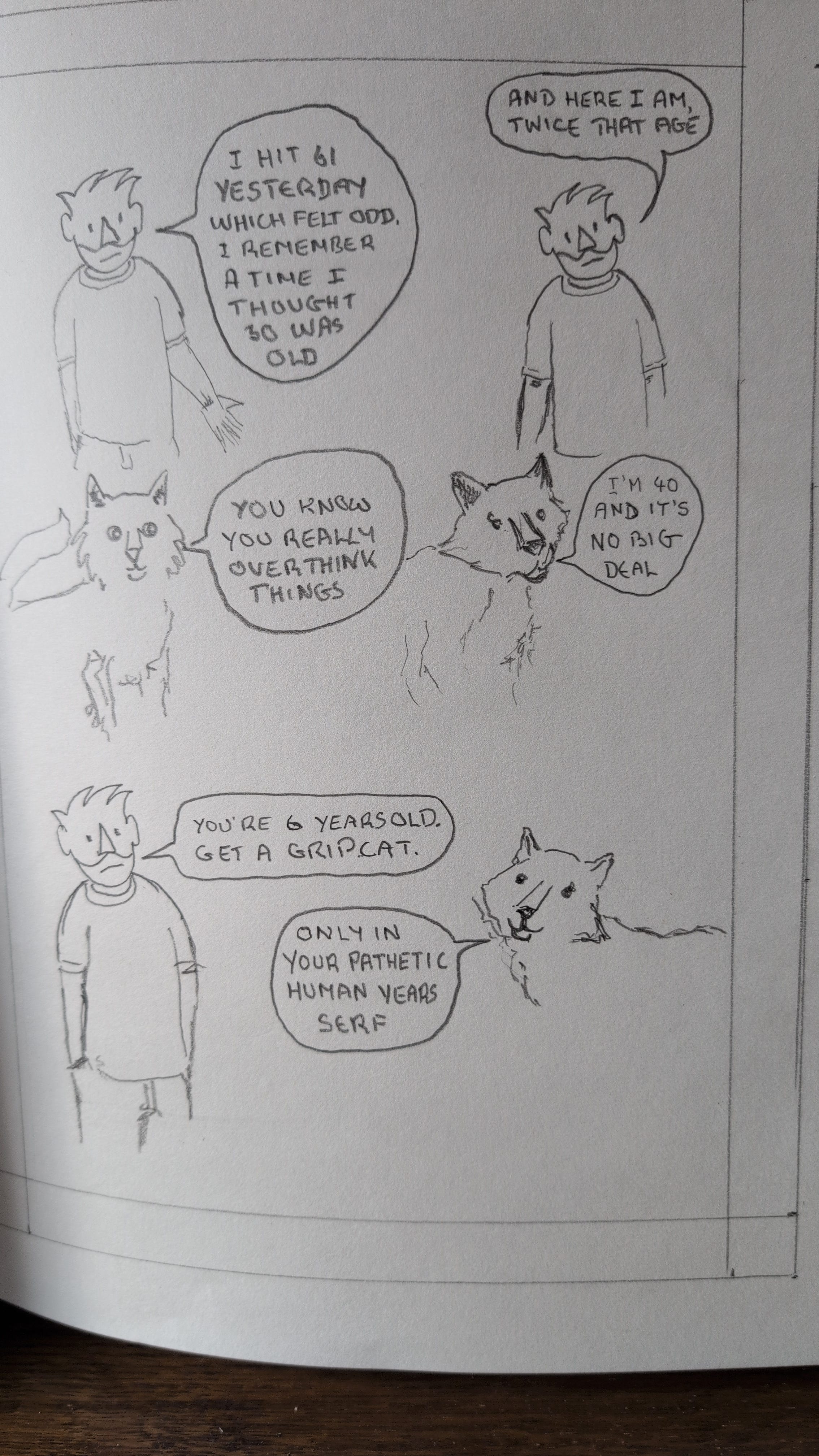 For about 6 months I've been using a cartoon of myself in journaling. On 10th September, I decided to add a talking cat. I have no idea why.