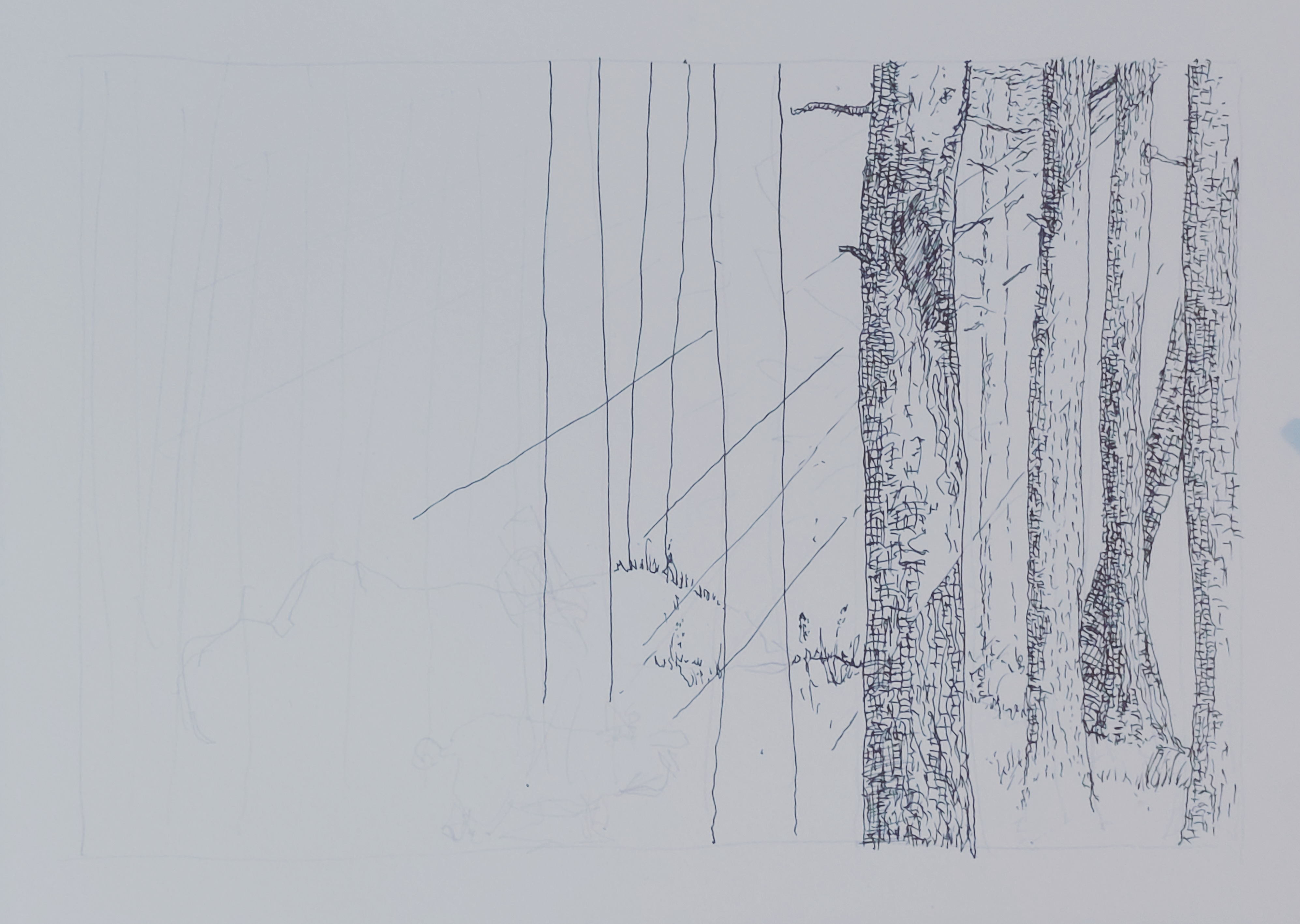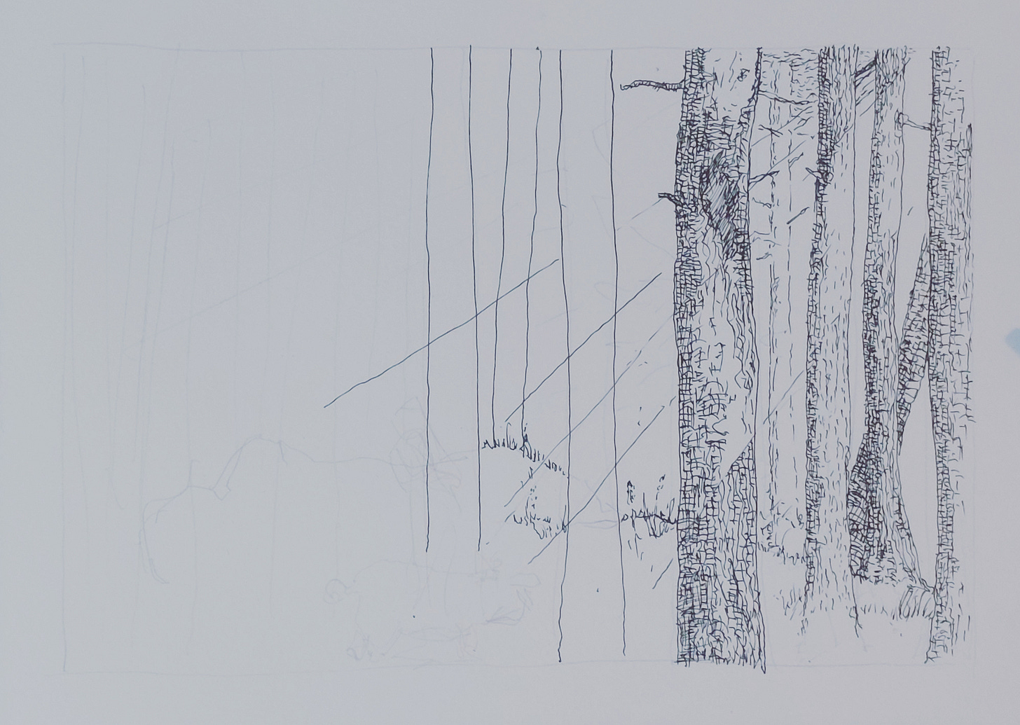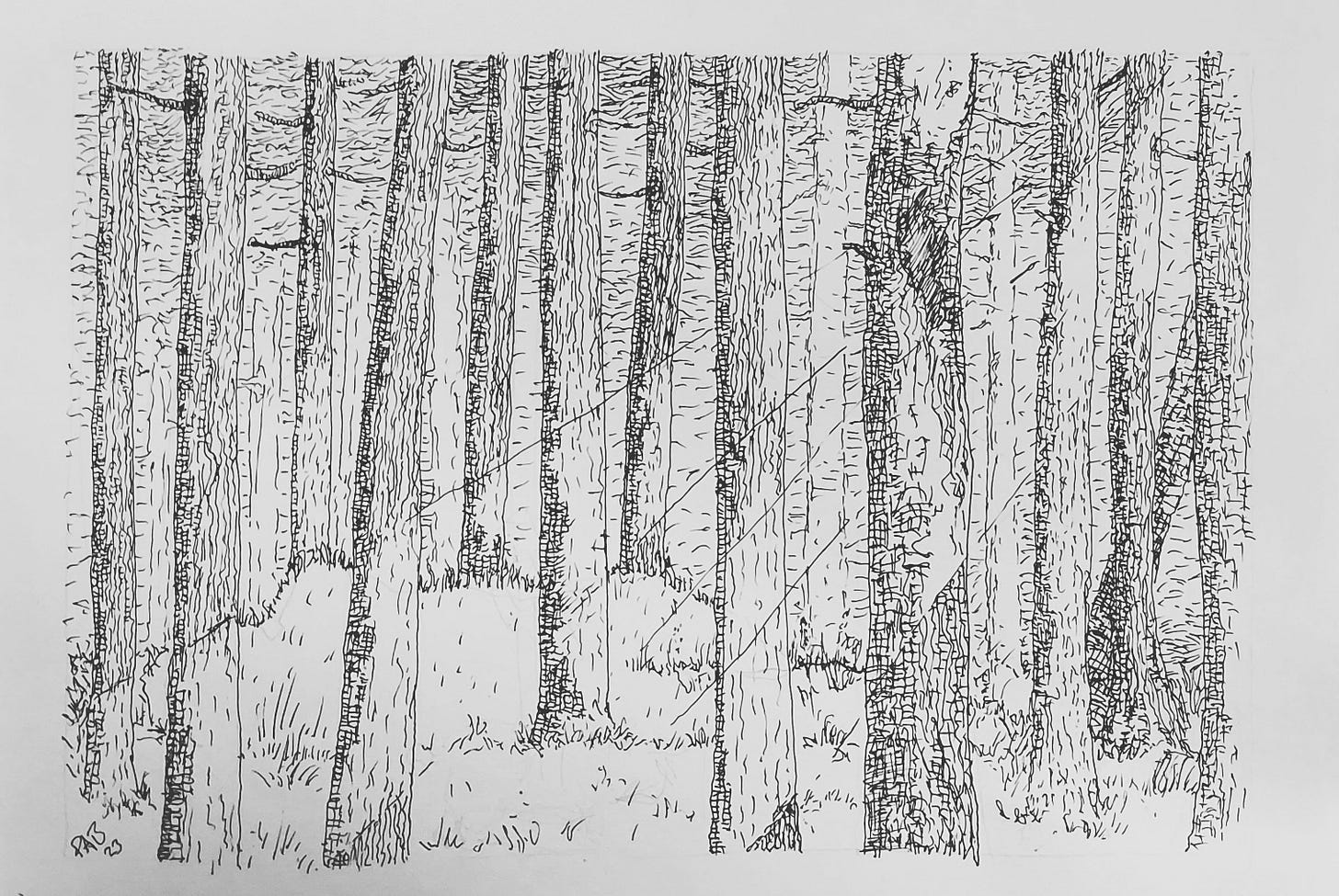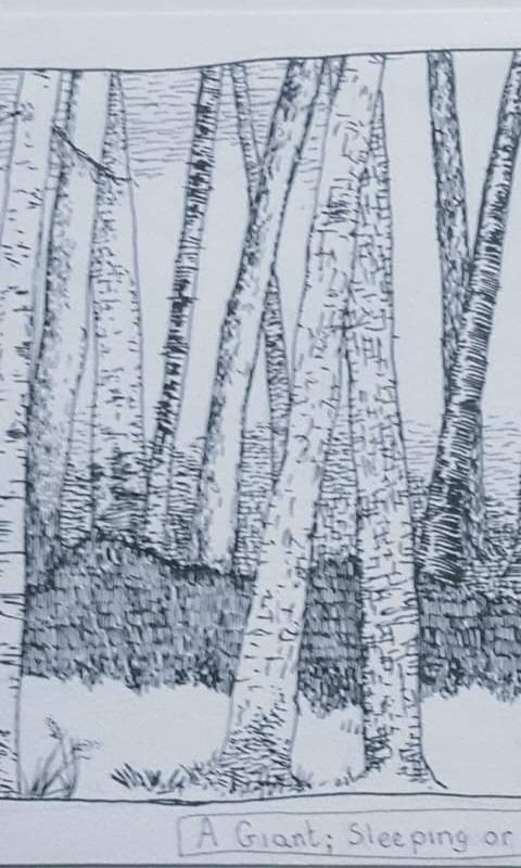 Sometimes age and experience make you a better artist and more able to do an idea justice. Below is the first version of an image and above is the latest version. The image was inspired by a briefly glimpsed view of a mound just inside some woodlands on the side of the M3 heading towards London. The brief glimpse gave me an idea of a giant asleep in the woods. I wanted it to be a black and white, textural image, inspired by classic book illustration. The first attempt lacked sonething. The variance in the trees worked OK but the mound looked wrong and it felt unfinished.