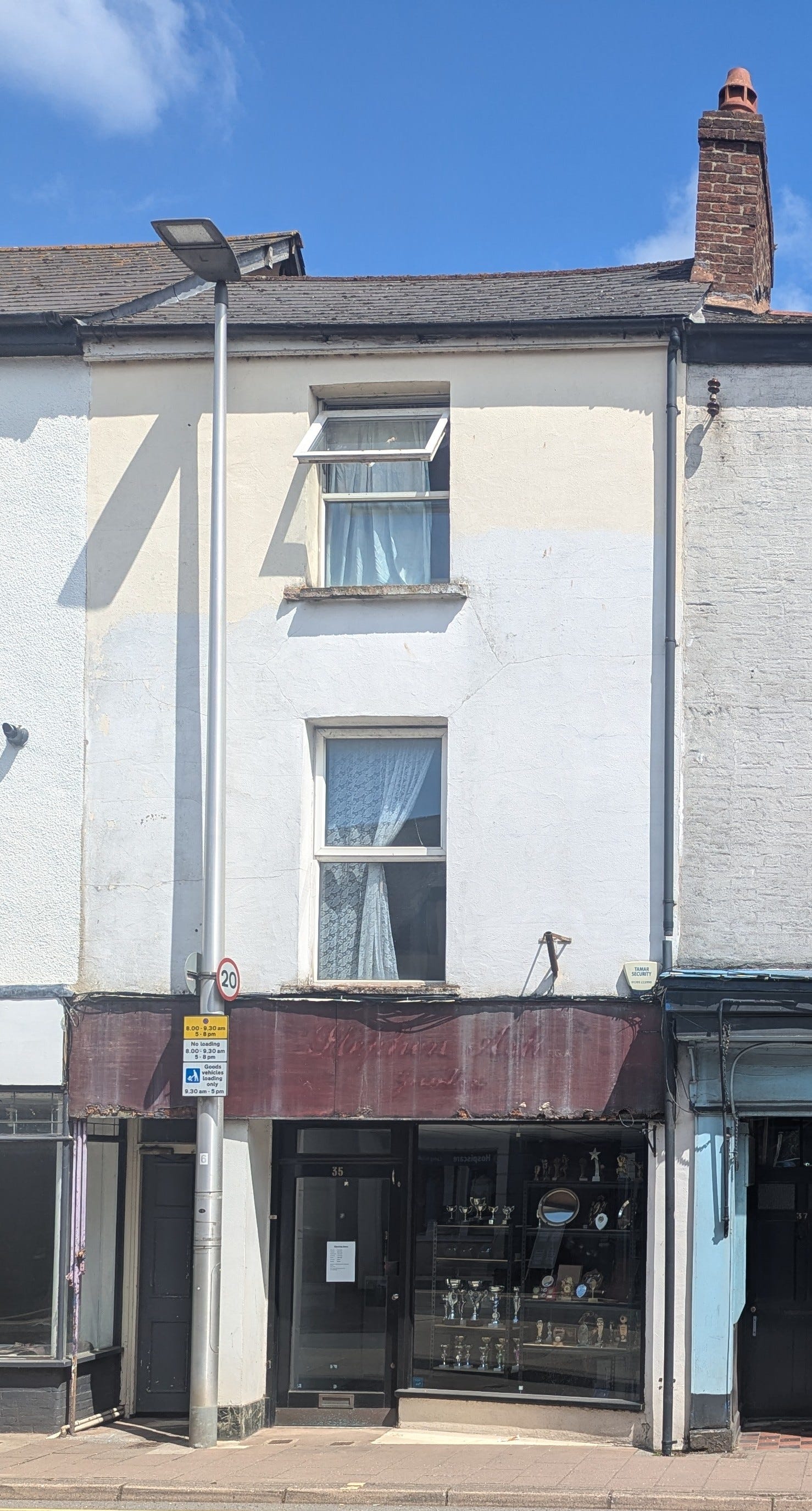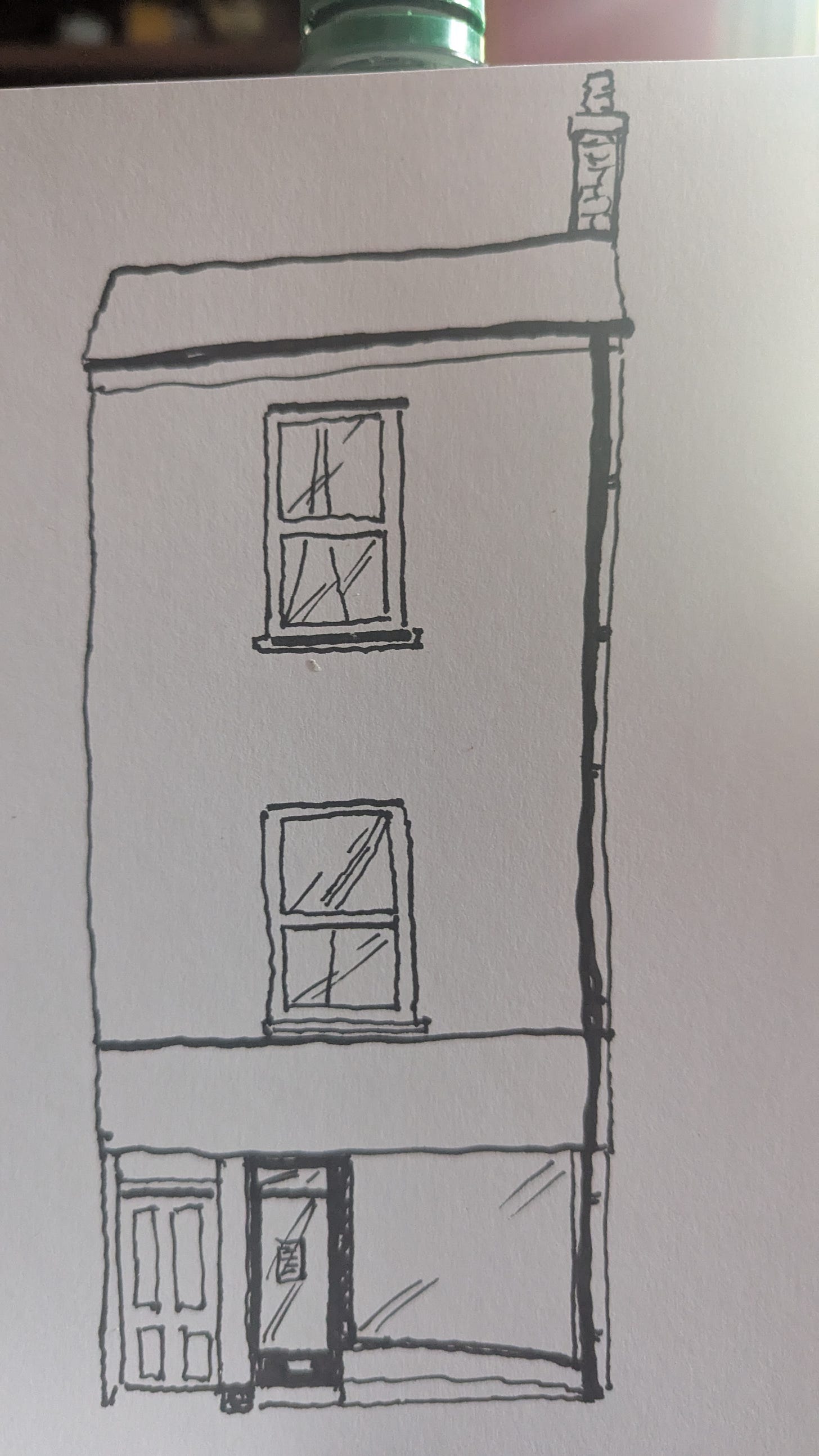 I was in the small town of Uffeculme recently and was struck by a tall, old shop front. I didn't have time to make a drawing so I grabbed a photo to draw from later. This is the photo.