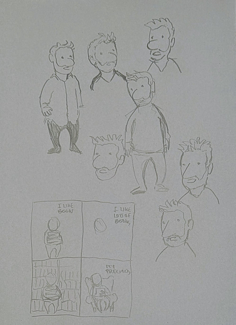 I started off on bluetits, trying to get the head right, then tried a dunling and an owl from memory and then started trying to design a cartoon version of me. I'll do some more before the night is over and tomorrow, picking up a pencil won't seem like a chore.